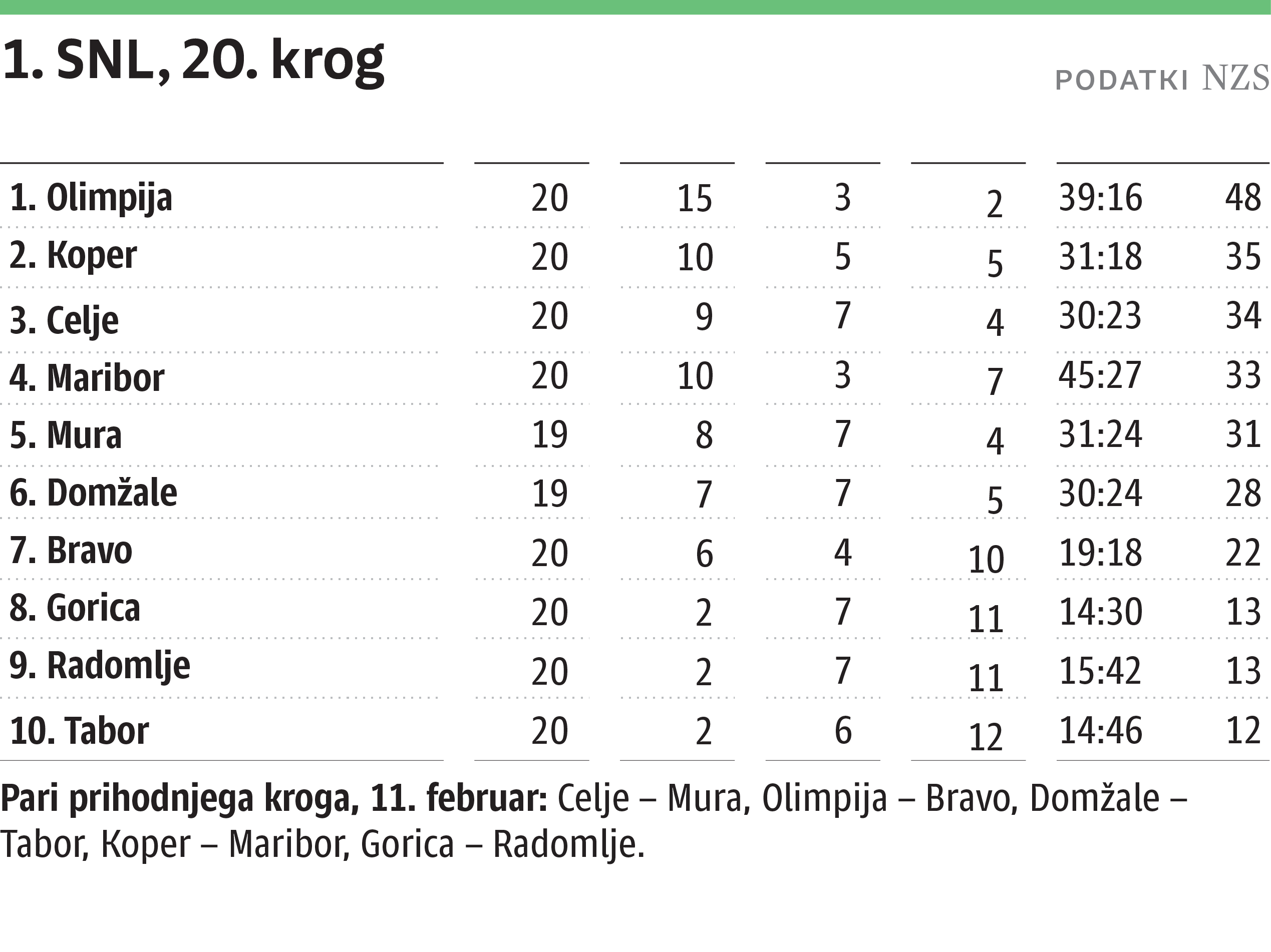 Olimpija na dvomesečni zimski premor, ki bo trajal do 11. februarja, odhaja s prednostjo 13 točk pred zasledovalci. Ljubljančani so se odlično znašli v sneženju in vetru na Krasu, saj so z rušilno močjo povsem razglašeni Tabor premagali kar z 8:0, kar je najvišja zmaga Olimpije v zgodovini prve lige na gostovanjih. Ljubljančani so tekmo začeli odločno in že po 17 minutah vodili z 2:0. V drugem polčasu se je razigral kapetan Timi Max Elšnik, ki je dosegel dva gola in bil pri dveh še podajalec, dva gola pa si je Tabor, ki je bil povsem ponižan, zabil kar sam.