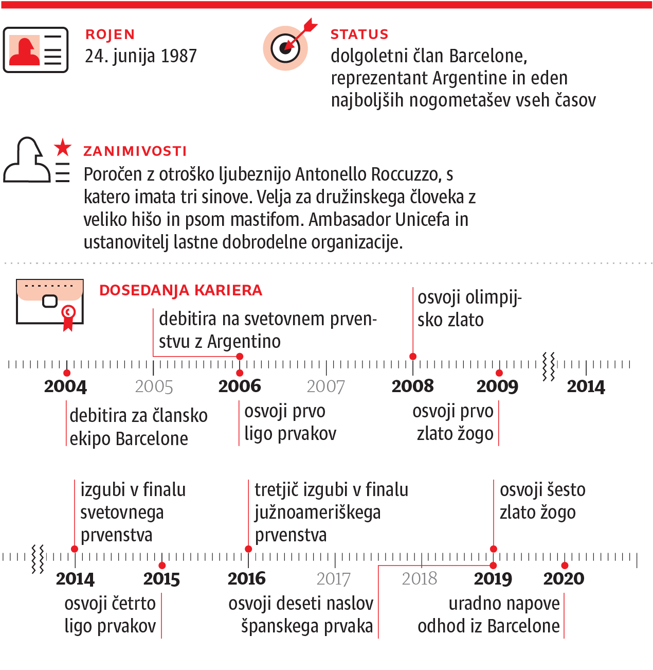 Svet še ni videl nogometaša, ki bi izboljšal toliko rekordov in imel v lasti toliko posamičnih priznanj kot Messi. Z Barcelono je v različnih tekmovanjih osvojil 34 lovorik, 634 golov in 276 podaj na 731 tekmah pa ga postavlja za daleč najučinkovitejšega nogometaša v zgodovini kluba. Če v Kataloniji na vsakem vogalu slavijo njegovo podobo, je manj priljubljen v rodni Argentini, s katero je osvojil le neatraktivno olimpijsko zlato in nikdar ni dosegel statusa Maradone. Reprezentanco z redkimi uveljavljenimi zvezdniki je štirikrat popeljal do finala velikih tekmovanj, a se vedno spotaknil na zadnji stopnici. Bil je blizu, a predaleč. Ko so vsi čakali, da bo svoji državi z odločilnimi goli vrnil staro slavo, je doživel razočaranje in jokal od bolečine. Ker se ni več počutil zaželenega in so mu navijači začeli obračati hrbet, je naznanil slovo od izbrane vrste, a se je kasneje premislil. Težko je verjeti, da bo z reprezentanco še kdaj bliže vpisu v večnost kot leta 2014, ko je Argentina v finalu svetovnega prvenstva brez doseženega gola v podaljšku klonila proti Nemčiji.
