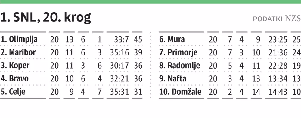 Izidi, 20. krog: Koper – Olimpija 1:2 (1:0, T. Jurić 13; Tamm 57, Florucz 74), Celje – Maribor 1:2 (0:1, Kučys 64; Tetteh 23, Elmaz 52), Domžale – Mura 0:1 (0:1; Vizinger 34), Nafta – Kalcer Radomlje 2:1 (0:1, Pihler 63, Špoljarić 90 + 2; Ljutić 44), Bravo Big Bang – Primorje 3:1 (2:1, Poplatnik 34, 44, Baboula 63; Gulič 17/11-m), pari 21. kroga, sobota, 15. februar: Maribor – Bravo (ob 15. uri), nedelja, 16. februar: Primorje – Koper (13.00), Mura – Celje (15.00), Olimpija – Nafta (17.30), ponedeljek, 17. februar: Radomlje – Domžale (17.30).