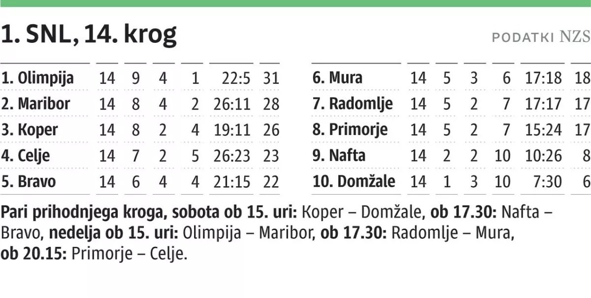Izidi 14. kroga v 1. SNL: Domžale – Primorje 0:0, Maribor – Radomlje 1:0 (1:0, Mbina 20), Bravo – Mura 2:1 (1:0, Trdin 37/11 m, 55/11 m; Maroša 91/11 m), Celje – Olimpija 0:1 (0:0, Florucz 50), Nafta – Koper 1:2 (0:2, Dragoner 50; Omladič 11, Jurić 16).