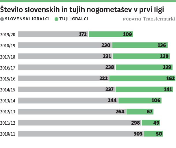 V Sloveniji velja splošna ocena, da v prvi nogometni ligi nastopa preveč tujih igralcev. Najbolj zanesljive podatke o številu tujcev v slovenskih prvoligaških klubih vodi specializirani nogometni portal Transfermarkt, ki je zabeležil, da je v letošnji podaljšani sezoni na slovenskih igriščih zaigralo 109 tujih nogometašev. Skupni delež tujcev znaša slabih štirideset odstotkov, kar pomeni, da ima skoraj vsak drugi nogometaš v slovenski ligi tuje državljanstvo. Je tujcev preveč? Kakšen je njihov učinek in kakšni so kriteriji klubov pri izboru tujih nogometašev?