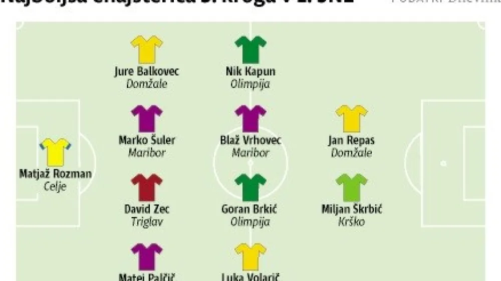 V tretjem krogu so največ pokazali najboljši trije klubi – Olimpija, Maribor in Domžale. Za najboljšega vratarja smo izbrali Matjaža Rozmana, ki je s štirimi obrambami med najzaslužnejšimi za prvo zmago Celja v letošnji sezoni. Desni bočni branilec Matej Palčič se je proti Rudarju veliko vključeval v napad in sodeloval v akciji za edini gol Maribora, pri katerem je Marko Šuler potrdil sloves komandanta obrambe in najboljšega štoperja v ligi. Čeprav je David Zec iz kranjskega Triglava star šele 17 let, je dobro ustavljal napade Krškega. Jure Balkovec je bil znova gonila sila igre Domžal po levi strani.