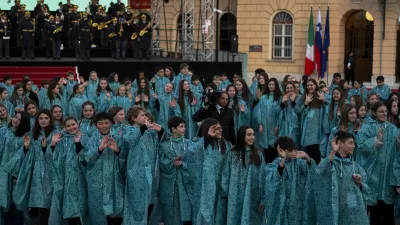 Rdeča nit slovesnosti, ki so se je udeležili številni pomembni tuji gostje in domala celoten domači politični parket, je bila pesem Skupaj/Insieme, s katero je leta 1990 na Evroviziji zaslovel italijanski pevec Toto Cutugno. Na skupnem Trgu Evrope, ki ima za mesti simbolni pomen, so jo pred predsednikoma obeh držav in kulturnimi ministri Evrope zapeli združeni mladinski zbori slovenskih in italijanskih šol, okrog 120 slovenskih in 80 italijanskih osnovnošolcev. »Glasba povezuje in je priložnost, da otroke vzgajamo v skupnem duhu, v povezovanju in sprejemanju različnosti,« je prepričana zborovodkinja Mojca Maver Podbersič, ki je mlade pripravljala na nastop. »Misliš, da se lahko kaj takega ponovi?« je Novogoričan spraševal prijatelja, ko so mimo njiju korakali člani številnega čezmejnega orkestra. »Dvomim, to je dogodek, ki se lahko zgodi enkrat v življenju.«