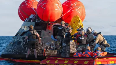 NASA Astronaut Reid Wiseman, Artemis II mission commander, exits the Orion crew module to join the three other crew in a raft, before transiting to the U.S. Navy ship USS John P. Murtha in the Pacific Ocean off the coast of California, U.S. April 10, 2026. NASA's Artemis II mission sent four astronauts on a flight around the moon in the Orion space capsule, which splashed down after the ten day journey. U.S. Navy/Mass Communication Specialist David Rowe/Handout via REUTERS THIS IMAGE HAS BEEN SUPPLIED BY A THIRD PARTY. THIS IMAGE WAS PROCESSED BY REUTERS TO ENHANCE QUALITY, AN UNPROCESSED VERSION HAS BEEN PROVIDED SEPARATELY. / Foto: Us Navy