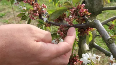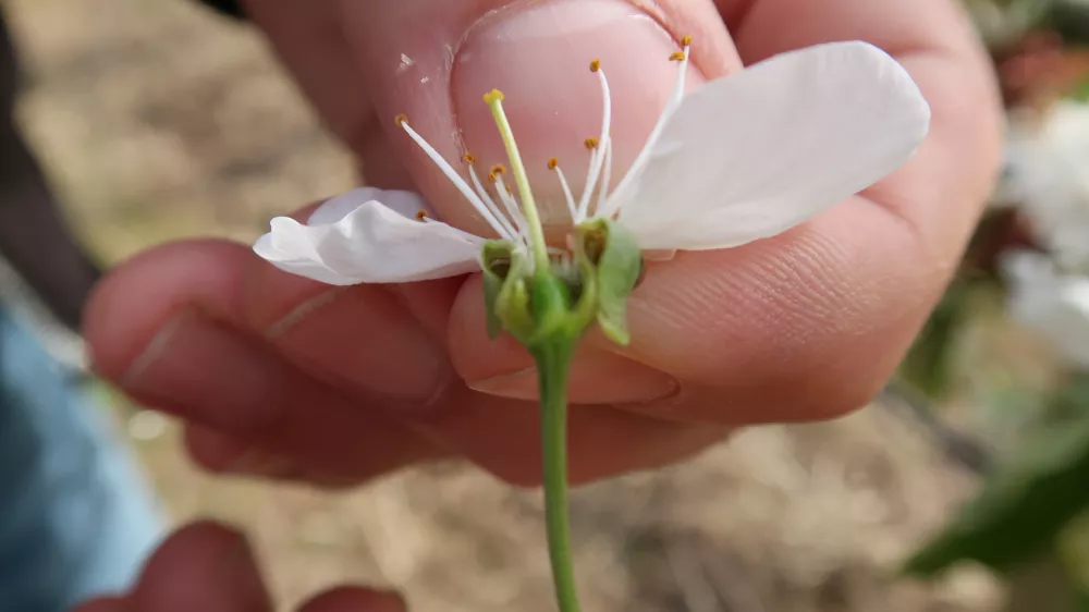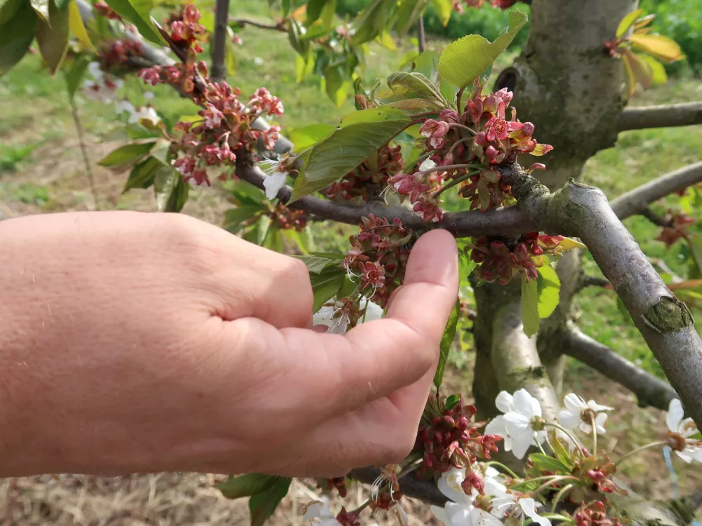 Aprilske pozebe postajajo stalnica, vprašanje je le še, v katerem tednu bodo sadjarjem naganjale strah v kosti. Letos je tudi že marčevska pozeba v marsikaterem sadovnjaku povzročila škodo. V sadjarskem centru, kjer preizkušajo, kako se različne novodobne sadne vrste in novodobni prijemi v sadjarstvu obnesejo na primorskih tleh, so si večjo škodo prihranili z oroševanjem. Mrzlić je prepričan, da bi brez tega mokrega protinapada ostali brez pridelka marelic in breskev, vprašljiva bi bila tudi letina češenj. Kaki jim je kljub oroševanju vseeno nekoliko »osmodilo«. »S kakijem imamo cirkus že od leta 2018, od takrat skoraj nismo imeli pametne letine. Mogoče bi ga morali začeti oroševati še prej, saj ne veš, učimo se sproti,« skomigne vodja centra. V sadovnjaku pokaže posledice marčevske pozebe. V delu sadovnjaka, kjer oroševanja ni, so pozebli češnjevi cvetovi na spodnjem delu krošnje. Zakrotovičili so se vase, pestiči v njih so propadli. Na zgornjih vejah so cvetovi k sreči preživeli, plodnica v njih je zelena in napoveduje, da se bo iz nje v kratkem pordečila češnja.