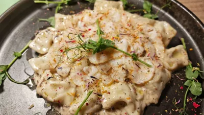 Taljata rečejo ohlajenim rezinam opečene govedine, ki jih kje drugje poimenujejo angleški rostbif, v vsakem primeru pa je bila to sočna hladna predjed, ki ji za volumen dodajo preveč rukole in grahovih poganjkov. Veliko je bilo tudi tatarskega bifteka, začinjenega bolj bogato, kot smo vajeni pri novodobnih mesnih minimalistih, in to nas ni prav nič motilo.