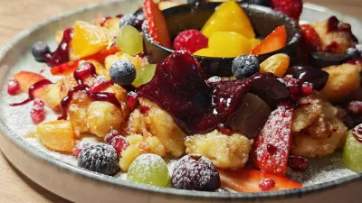 Pa sladice? To je kategorija, v kateri imajo marsikaj, tortice, ameriške palačinke, sufleje... Malce, ker nas je zanimalo, malce pa zaradi priporočila (»Res je dober«) smo naročili šmorn, ja, cesarski praženec. Presenečenje je bilo res popolno. Že iz foto materiala se vidi, da je to bolj sadna solata, v kolobociji pa se skrivajo koščki šmorna, ki so bili bolj kot šmornu podobni njokom in v vsakem primeru premastni.