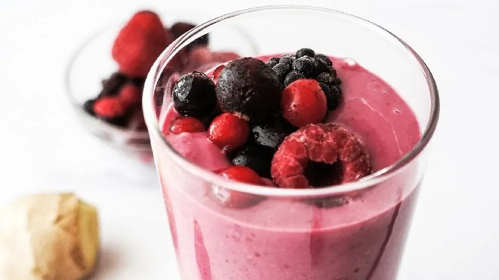 V mešalnik dajte banano, jagodičevje, ingver, arašidovo maslo in kefir ter vse zmiksajte v svilnat smuti.