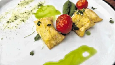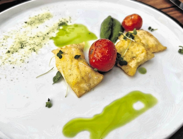 Ne preobilni hladni predjedi smo podložili z belo zvrstjo De Baguer iz Kleti Brda, ki je odlično sodelovala do konca menija. Še manjša kot hladna predjed je bila porcija testenin – trije ravioli, polnjeni s skuto in pehtranom, dva češnjeva paradižnika, zeliščno olje in peteršiljeve drobtine.