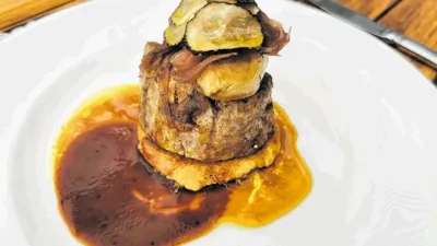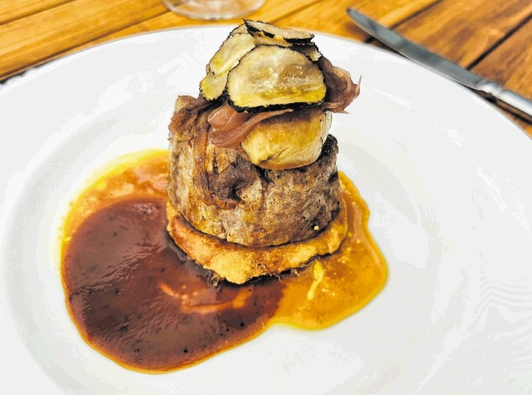 Najprestižnejša jed večerje oziroma degustacije je telečji file z veliko rezino gosjih jeter, podložen z ocvrto rezino kruha. Popolno pečeno meso obogatijo s čebulno marmelado, tartufi pa tudi nesrečnim tartufovim oljem, ki si ga odlična teletina in gosja jetra res ne zaslužita.