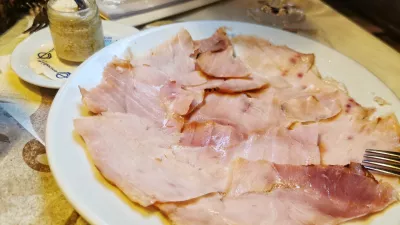 Še ena glavna jed so prašičkova lička, ne tako zdrizasta, kakršna brez vsakega razloga veljajo za specialiteto v Sloveniji, ampak čvrsta kot pravi kosi mesa s praženim krompirjem in polento (15 evrov). Kot pravi Slovenci smo k mesu in prilogi jedli tudi solato, a ta ni bila povsem običajna – motovilec zabelijo z naribanim hrenom in jabolki.
