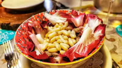 V pozdrav še prej postrežejo polpetine, ocvrte mesne kroglice, za pet evrov pa v kozarec natočijo zelo suho peneče in osvežilno vino iz bližnje kleti Castello di Spessa. Čestitke vinarju, potem pa smo se takoj lotili solkanskega radiča. V začetku ga pripravijo kot solato, ne preveč okisanega, prijetno hrustljavega, s toplim fižolom. In tega enostavno ne smete preskočiti. Naj še omenimo, da je pri Alla Luni nekaj jedi z menija ne samo v mittelevropskem, ampak kar v slovenskem slogu – v to serijo sodi slasten, skoraj sladek kuhan pršut z okisanim hrenom. Radič in kuhan pršut, torej. Uvod, kot smo si ga lahko samo želeli.