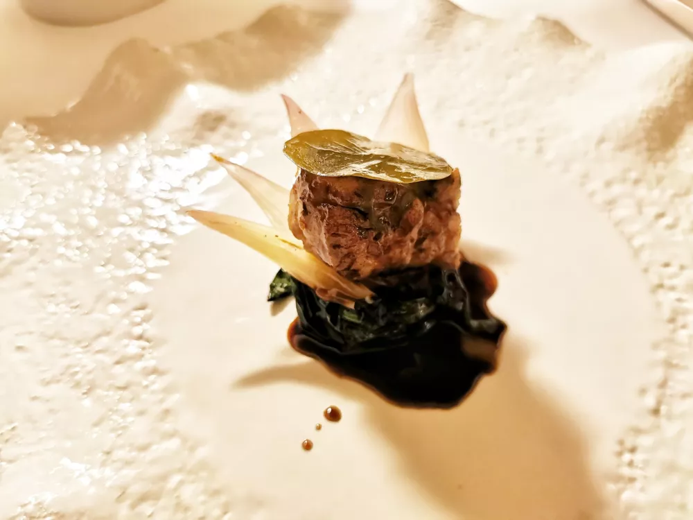 Potem so na vrsti testenine, in to kakšne! Prve so bile hladne, tanki špageti oziroma angelski laski znamke Benedetto Cavalieri so bili obogateni s sezamom, pečeno papriko, chorizom, surovimi škampi in kokosovo smetano. Sijajna jed. Nič niso zaostajali tortelli, polnjeni s friko, ki jim dodajo zimske okuse repe, rdeče pese in belega tartufa. Tako pri laskih kot pri tortellih gre za jedi, ki bi lahko uspešno nastopale tudi samostojno, zunaj menija, res so bile pripravljene tako, kot znajo testenine pripraviti samo naši sosedje, a so v opciji »à la carte« zelo drage, vsaka po 45 evrov.