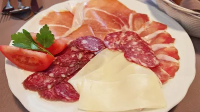 Za pet evrov (ja, za 24-krat manj) smo dobili soliden krožnik, recimo za dve lačni osebi, na katerem je kraljeval čvrst primorski pršut, za hitro primerjavo smo dobili tudi hišni pretežno svinjski salami, lansko in letošnjo. Katera je boljša? Težko je reči, lanska je malce bolj pikantna in to je gotovo dobro, smo se mastili in napadli še nekaj kosov budžole. Za spremljavo so bili Modrijani, za spremljavo je bil Brendi, pa tudi nekaj preveč enostavnega sira in paradižnik. Kot rečeno, narezki niso v ponudbi kosil, jih pa radi prinesejo, konec koncev jih morajo velik del narezati za zajtrke pohodnikom, ki se odpravijo na bližnje hribe in v zelene gozdove, saj se, kot se pohvalijo, od tod v daljavi vidijo tudi Alpe.