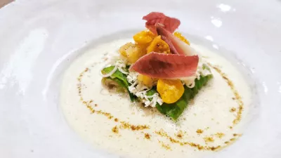 Prva »uradna« jed menija, ki si ga je zamislil Fuchs, je ožgan file sardine, ki ga podložijo z gomoljastim trebeljem, oreški in češnjevo omako. Sledi jeseter iz soseščine, dimijo ga, obložijo z rezino kolerabe in mu dodajo njegov kaviar, s kislim zeljem aromatizirano masleno omako ter pire z rjavim maslom. Jakobove pokrovače pripeljejo iz Istre, na krožniku jih kombinirajo s topinamburjem v obliki pireja in kot polnilo v cmoku ter rezinami svežih šampinjonov.
