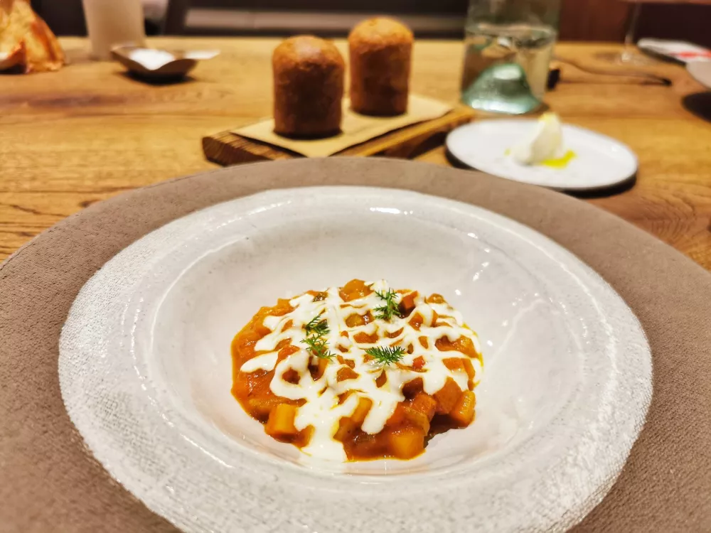 Tempo je hud, jedi si sledijo druga za drugo in vse se malce upočasni šele pri glavnih jedeh. Okusi so povezani, čeprav se nekatere sestavine srečajo prvič. In še, jezik je nemški, brez angleščine, še sreča, da smo pri mizi tudi takšni, ki se nekako znamo sporazumevati po štajersko.