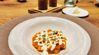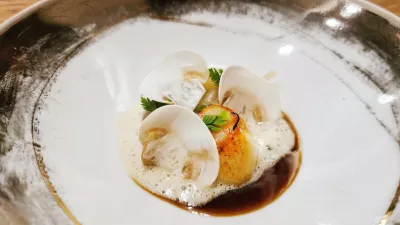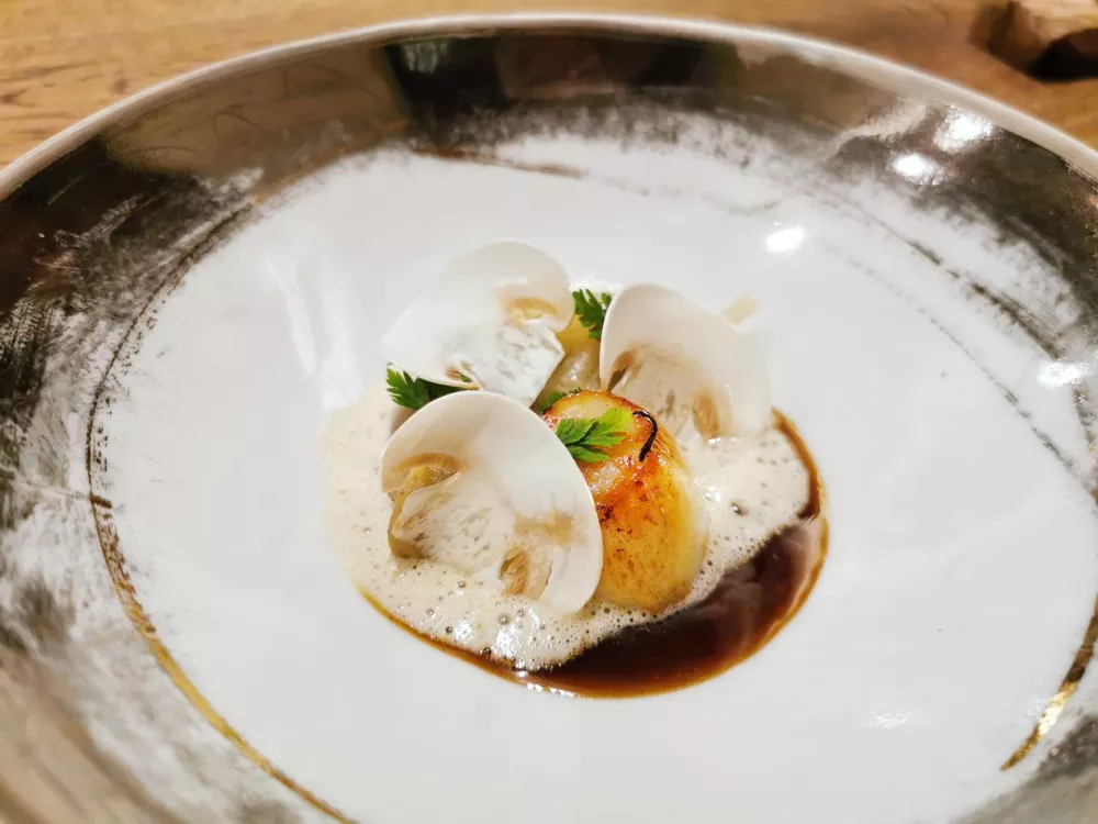 Podpisna, najbolj znana Fuchsova jed je raviol z rumenjakom na kremni špinači, prelit s parmezanovo emulzijo in posut z nastrganimi tartufi iz Périgorda. Najbolj konkretna, gotovo, a tudi najbolj dodelana jed med mnogimi predjedmi. Nato smo hitro spet odpotovali na morje, tokrat z morskim listom, vongolami in klapavicami. Bučni pire in zelena papaja iz bližnjega Stradna dodata v morje nekaj štajerskega, kombinacija pa nedvomno spominja na tajski kari.