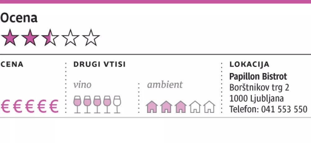 Koncepti, pardon, filozofije mnogih novih lokalov v Ljubljani so si pravzaprav zelo podobne. Ob večerjah in kosilih veliko govorijo o zajtrkih in popularnih brunchih in mnogi so tudi malce bistroji, po naše okrepčevalnice, kar koli že ta izraz pomeni – a tisti, ki ste obiskali kak pravi francoski bistro, utegnete biti v Ljubljani razočarani. V primeru Papillona (metulj po francosko, kajne) poimenovanje bistro pomeni preozke mize, kaos v strežbi in visoke cene za banalno majhne porcije.