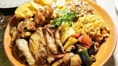 Velike porcije mesa so podprli z enostavno mešano solato z bučnim oljem, priloge pa so bile več kot obilne in nekatere med njimi zelo nasitne: pri pojedini so sodelovali pečeni krompir izpod peke, sirovi štruklji, ajdova kaša z gobami in ješprenj z zelenjavo.