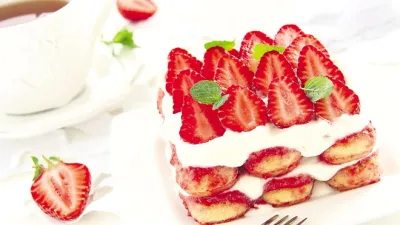 PripravaOprane jagode narežemo na rezine, debele 3 mm. Smetano stepemo tako, da ji na polovici dodamo sladkor in postrgano vsebino vaniljevega stroka. Nežno primešamo maskarpone. Piškote napojimo z jagodnim sokom, ki mu po želji primešamo rum ali liker. Namesto soka lahko uporabimo mlečni kakav. Polovico piškotov tesno drugega ob drugem zložimo v model. Nanje nanesemo polovico kreme in razporedimo četrtino jagod. Na jagode spet plast piškotov in plast preostale kreme, na vrh pa lično razporedimo jagode. Čez noč postavimo v hladilnik, postrežemo s sladoledom.