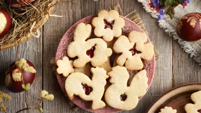 Linzer cookies in the shape of Easter animals filled with strawberry marmalade on a red plate, with decorated eggs / Foto: Madeleine_steinbach