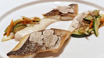Za glavno jed degustacije pa so postregli file divje orade z izvrstno hrustljavo kožico, cvetačno kremo in prepraženo zelenjavo s tabaskom. Na ribi so bili tudi črni tartufi, ki pa so bili bolj za okras, ker kakšnega vonja ali okusa niso oddajali.