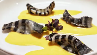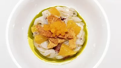 Podobno kot na pari kuhani, ohlajeni in narezani lignji s pomarančo, pomarančnimi perlami, čipsom iz čičerike in redukcijo rdečega vina. Nekaj res slastnih grižljajev.