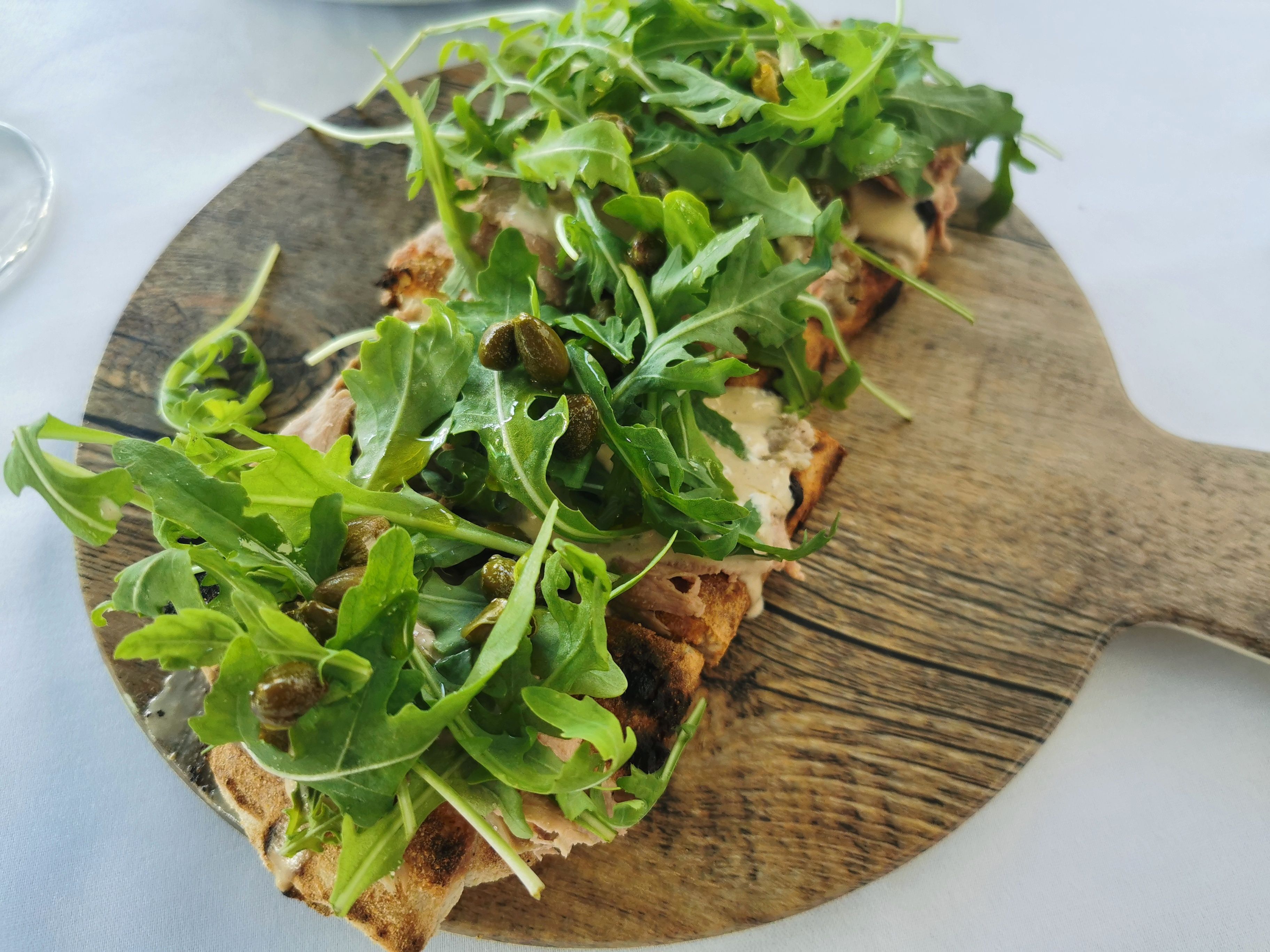 Ker je Mirje tudi picerija, se s krušnim testom radi poigrajo tudi ob drugi ponudbi. Denimo pri fokači, ki jo obložijo z vitellom tonnatom, torej teletino z omako iz tune, in grmičkom rukole, ki jo publika menda ljubi, naše omizje pa črti.