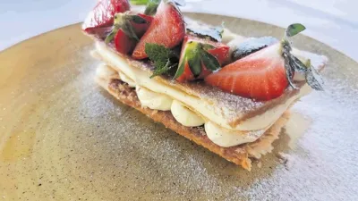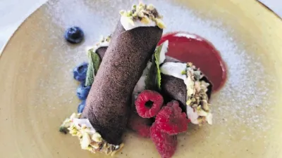 Končali smo seveda po italijansko: ob še nekaterih za našo zahodno sosedo običajnih sladicah pripravljajo simpatičen millefoglie, v našem primeru z jagodami, in nekoliko manj sladke cannole z rikoto in maskarponejem ter koščki čokolade in pistacijo, ki jim priložijo maline in borovnice.