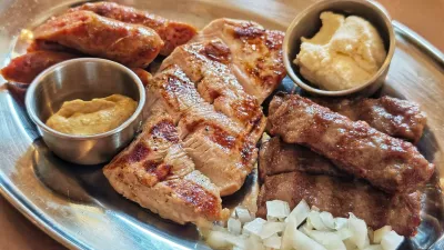 Tudi pri glavnih jedeh so iz kuhinje predlagali kombinacijo različnih jedi. Osnovna ideja: tris dišečih govejih čevapčičev, lepo pečena in kot taljata narezana vešalica ter papricirane hišne klobasice, ki jih delajo sami. Za prilogo so ocvrli debelo odrezane rezine krompirja, popekli lepinje in priložili urnebes, kajmak, gorčico in pečene pekoče paprike.