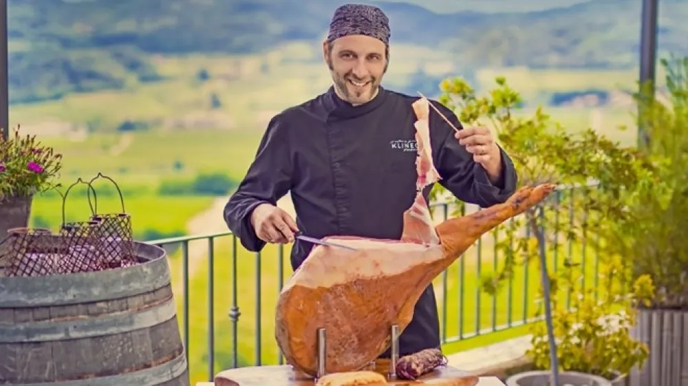 Tiste, ki jih ne privabi vonj po hrani, sploh pršutu, pritegne izjemen razgled na Goriška brda, nekaterim je dovolj že to, da domačija s pol ducata sob ponuja tudi eno najlepših namestitev v tistih koncih. A ostanimo pri hrani, ki je glavni razlog, da boste zavili h Klincu na Plešivo. Uroš, ki je z bratom Aleksom kuhinjo z italijanskim pridihom spoznaval že kot otrok, je z ženo Nejko leta 2008 sklenil, da je čas za samostojno pot, in zapustil domačijo Klinec v Medani, na katero s svojimi vini vabi brat.
