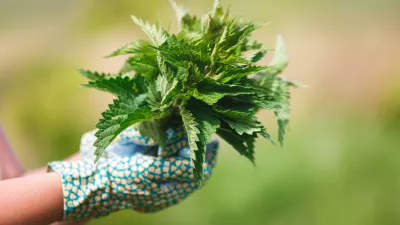 Freshly Picked Nettle. Woman holding a bunch of fresh stinging nettles with garden gloves, selective focus / Foto: Sstajic Getty Images