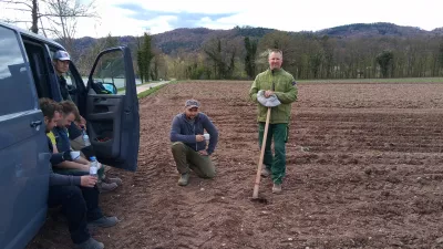 Ob poti, kjer na eni strani teče Sava, na drugi pa se razprostira Hotemeško polje, kjer so v času Avstro-Ogrske gojili jabolka, jih vozili na Dunaj in celo v Švico, naletimo na družbo možakarjev, ki delajo na polju. Matjaž Knavs iz Drevesnice Krajšek nam brž pove, da je sajenje sadik v polnem teku. »Sadike ročno okopavamo, ker jih ne škropimo. Najprej jih sadimo za divjake, da jih bomo lahko cepili naprej. Vsak dan smo tu in delamo različna opravila na polju, jeseni pa bomo sadike izkopali in jih pripravili za prodajo. Tu imamo jabolka, hruške, slive in češnje, tam višje pa tudi jagodičevje in lešnike.«