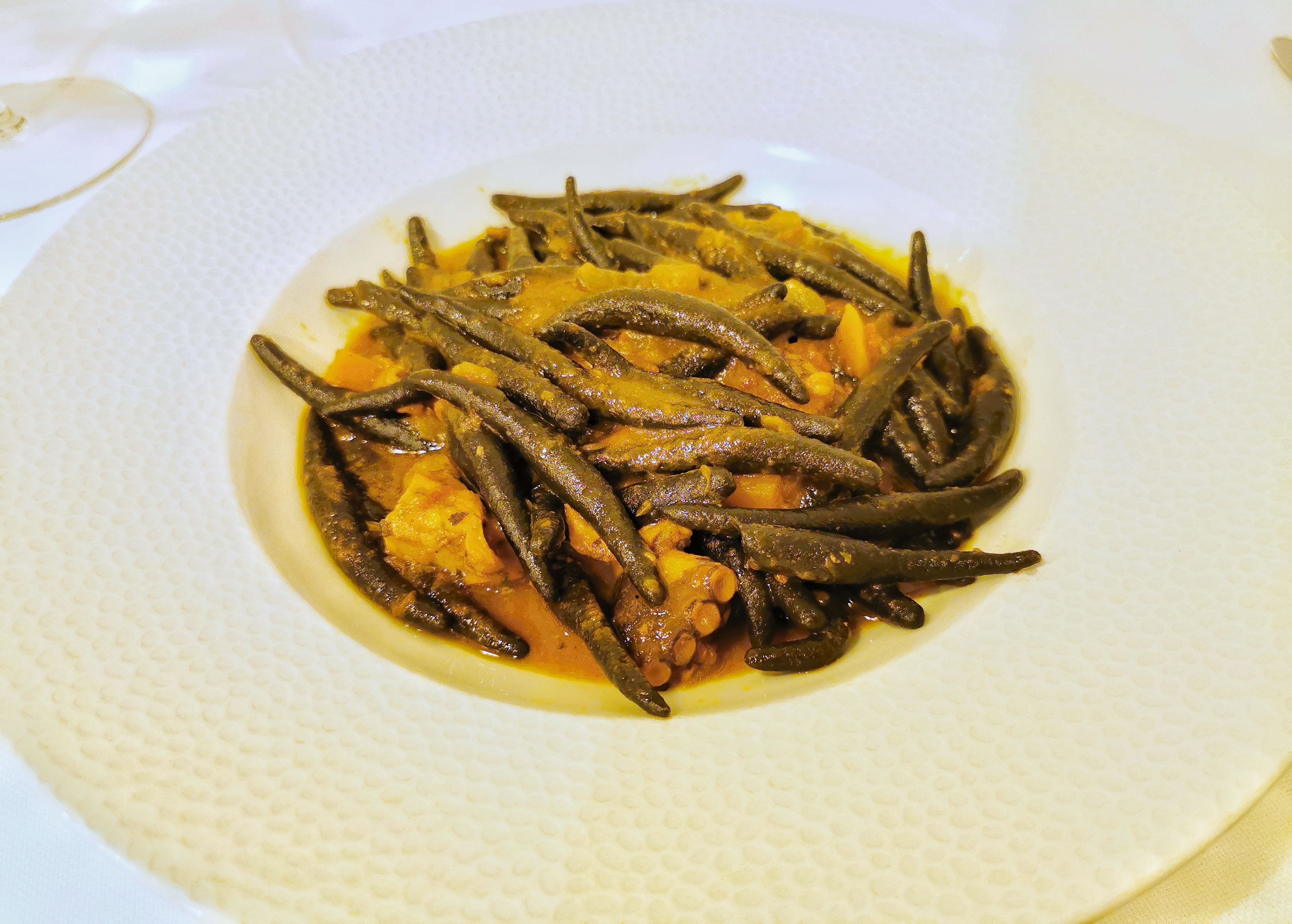 Za tiste, ki jih morje niti v Istri ne prepriča, je na voljo tudi nekaj celinskih jedi, a so konec koncev tudi siri z olivami in goveji tatarski s tartufi del lokalne zgodbe. Mimogrede, morda bi v ponudbi pričakovali tudi kakšno mineštro, bobiče ali joto, a zdi se, da sam koncept hranjenja narekuje lahke juhe, recimo bistro ribjo ali govejo juho, ki omogočajo, da pokusite več ribjih specialitet. Dobesedno navdušeni boste denimo, če boste pokusili rahlo pikanten golaž s sipicami (12 evrov). Jed, ki je ni dobiti povsod, je že kar nasitna, še posebno ker sodeluje s popečeno polento z olivami. Med toplimi predjedmi so na svojem mestu tudi domači pljukanci s sipinim črnilom, testenine, ki jim primešajo izvrsten ragu iz jadranske hobotnice (14 evrov).