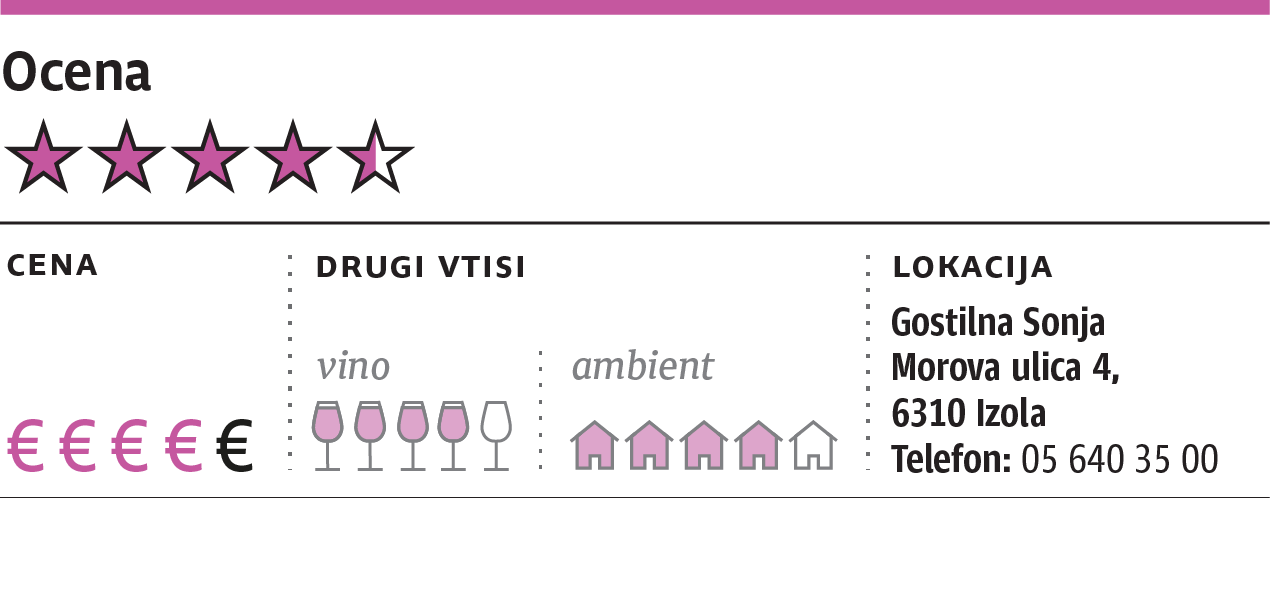 Treba je omeniti, da smo zadnja leta na Obali med morskimi restavracijami veliko časa namenili iskanju prenovljene avtorske kuhinje in malce zapostavili klasične zimzelene gostilne, med katere gre šteti tudi ali predvsem Sonjo v Izoli. Razlogov je več. Tudi ta, da smo pod vplivom avtorskih trendov iskali nekaj posebnega, pa tudi ta, da smo bili ob zadnjih obiskih standardnih morskih gostiln marsikje razočarani tako nad sestavinami kot kuhinjo in vinsko ponudbo.