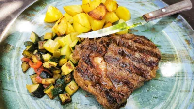Ribeye z rumeno pečenim krompirjem. Foto: Miha First