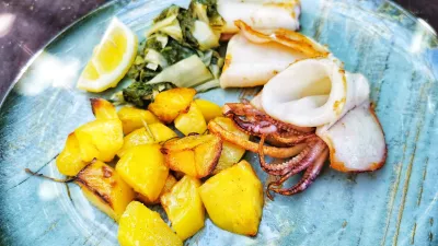 Pred glavnimi jedmi, da ne bi izbirali sami, ponudijo refošk Vinales. Zakaj? To je refošk, ki ga pijejo tudi nasprotniki refoška. Dobro, ampak še vedno je refošk, je odgovarjal ženski duet omizja, ki v nedeljo enostavno ni imelo ne časa ne energije za kakšne konkretnejše steklenice, ki bi se srečale z glavnimi jedmi. Recimo z njoki z divjačino (13 evrov), ki se lahko merijo z vsemi najboljšimi predstavniki svoje vrste pri nas. Vsaj ugajal je tudi ribeye z rumeno pečenim krompirjem, ki je bil najdražja jed kosila (28 evrov), po pričakovanjih pa se je svet ustavil ob jadranskih lignjih. Ni dvoma, velika porcija s pečenim krompirjem in blitvo je tisto, kar utrujeni turist potrebuje, še posebej, če mu to lahko ponudijo za zmernih 21 evrov.