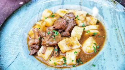 Jasno, nedeljska družba potrebuje krepko govejo juho in ravno takšno kuhajo pri Kraškem robu. Tisti dan so imeli še gobovo in zelenjavno, a se je naša odprava raje odločila pokusiti v naših krajih premalo opevano kombinacijo sipe s polento. Morski golaž, specialiteta, ki tako, kot jo pripravijo v Črnem Kalu, zadovolji še tako izbirčne okuse (13 evrov).