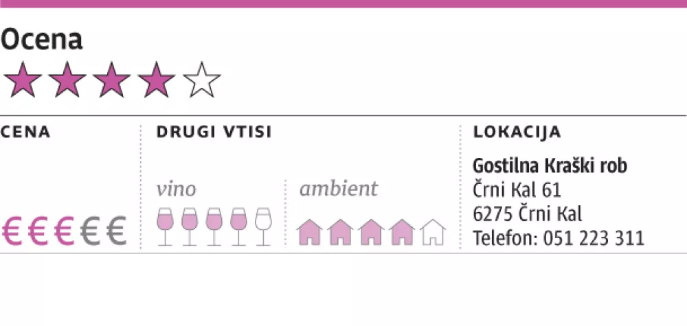 Naj povemo, da je tempo natakarjev ob koncu našega kosila rahlo popuščal. Verjetno bodo morali v času največjega navala – gneča se ob teh cenah in takšni ponudbi gotovo ne bo zmanjševala – najeti še kakšen par rok, da bodo nosile krožnike. Tudi krožnike s sladicami, kjer kuhinja spet ni zatajila. Na Primorskem boste morda kje dobili podobno sladko jabolčno krostato, zelo težko pa takšno kremšnito, kot jo imajo pri Kraškem robu. Če ne spite blizu, pa istrsko ponudbo digestivov na črnokalskih ovinkih enostavno odsvetujemo.