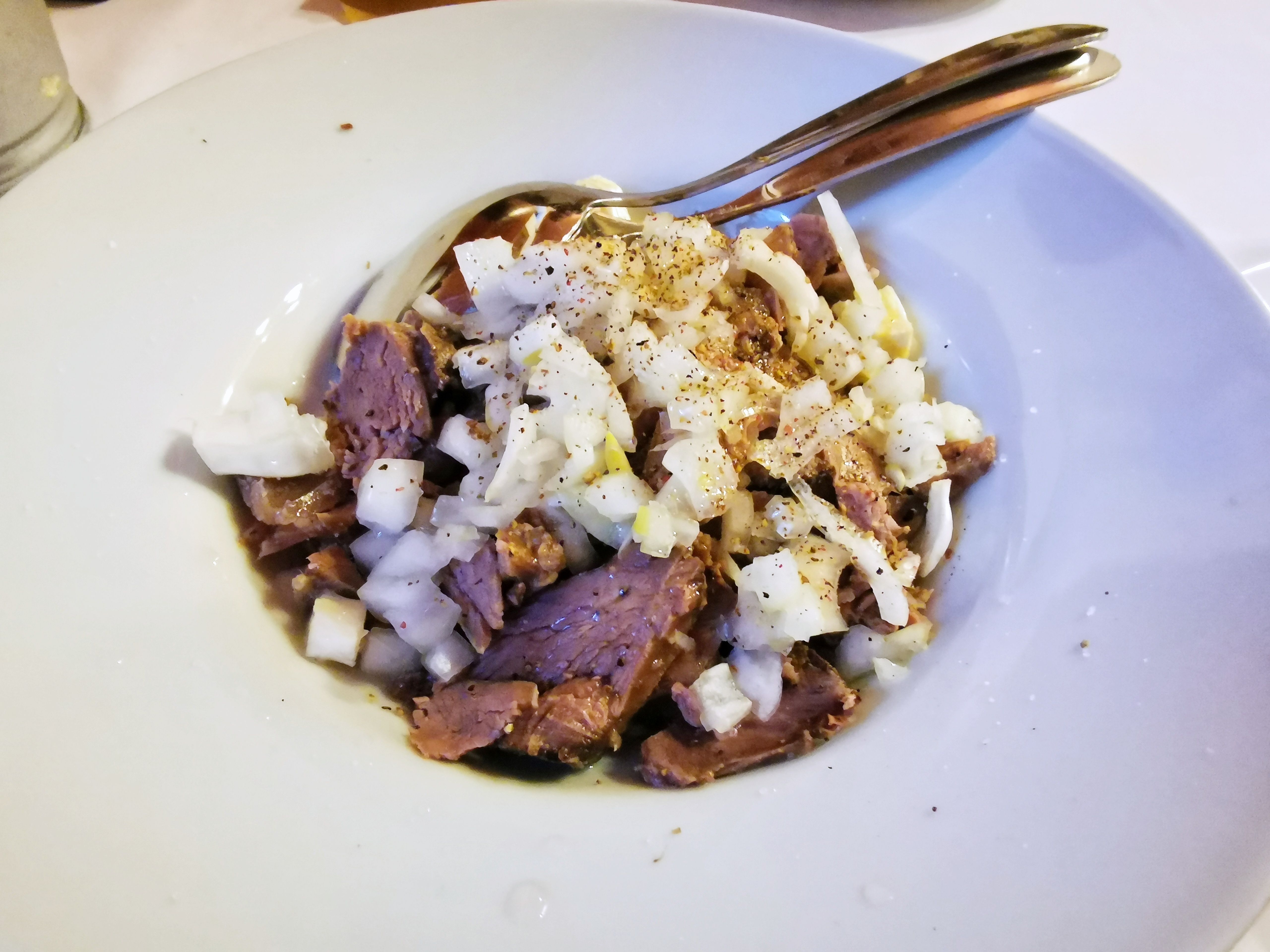 Začeli smo s hladnimi predjedmi, na veliko ponujajo pršut in panceto iz Furlanije, nam pa se je zdela bližja domača suha salama, ki je povezala svinjino in govedino. Zelo na tanko narezana, a okusna in za današnje čase kar slana jed se je srečala zgolj z nekaj kumaricami. Škoda, da dišečim kolobarčkom ne dodajo kakšnega sira, je bila pa cena 4,5 evra za razmere, ki vladajo pri nas, pravzaprav hudo ugodna. Dražja, devet evrov, je bila velika porcija govedine v solati, ne preveč začinjena verzija, ki pri Pečnikarju predvideva na drobno narezano govedino in čebulo. Priporočamo.