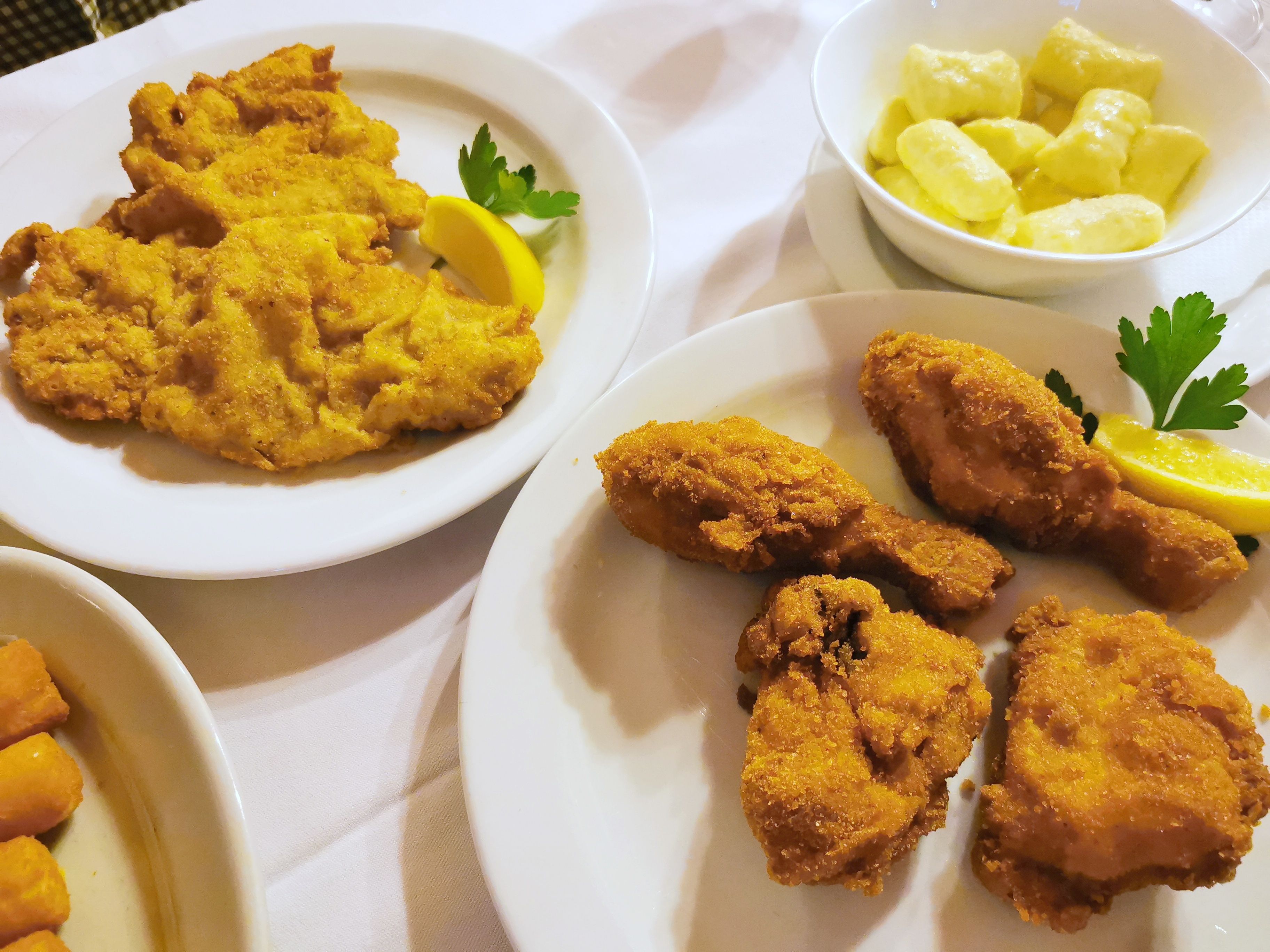 Kaj pa pohana piška, ste se vprašali tisti, ki ste pri Pečnikarju že jedli. Slovensko, skoraj obredno jed, ki bi jo moral zaščititi Unesco, je v Šentjakobu mogoče dobiti na mnogo načinov. S kožo ali brez. Celo ali polovico (14,5 evra). Pa tudi posamezne kose – nogica, torej bedro v svoji kompletni obliki, pride v dveh kosih in stane sedem evrov. Štiri evre je perutnička. Kakor koli, naša bedrca so bila,
