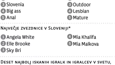 Na četrtem mestu so lezbične vsebine, ki sicer globalno pogosto zasedajo vrh lestvic. Med prvo peterico je tudi kategorija »mature«, povezana z iskalnim pojmom MILF. Opazno je zanimanje za domačo produkcijo – izraza »Slovenia« in »Slovenian« sodita med pogosteje uporabljene ključne besede.