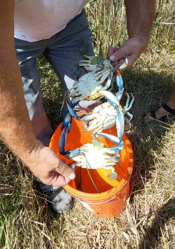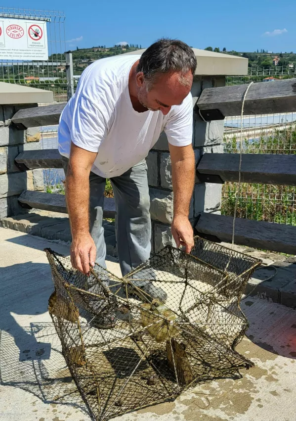 Nevio Vižintin v vršo nastavi ribo, da privabi modre rakovice. / Foto: Katja Gleščič