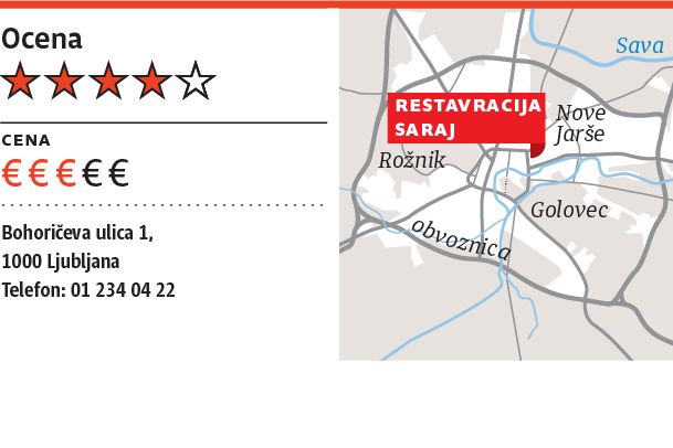 Pekarniško ozadje Saraja razkriva tudi dejstvo, da ob hrani prinesejo kakšne pol kile svojega kruha, ki se lahko poveže z vsem, kar ponujajo kuhanega ali pečenega. Tudi s prebrancem, ki je močno zapečen na vrhu pospremil mesne jedi: ene najboljših čevapčičev na terenu (osem evrov), uštipke, ražnjiče, sarajevski klobasici in nepretresljiva piščančja zrezka. Vsaj tako dobro kot čevapčiči se je obnesla pleskavica s sirom (deset evrov). Pri solatah pa naj priporočimo pečeno papriko, v eni porciji so tri velike paprike in obilica česna.