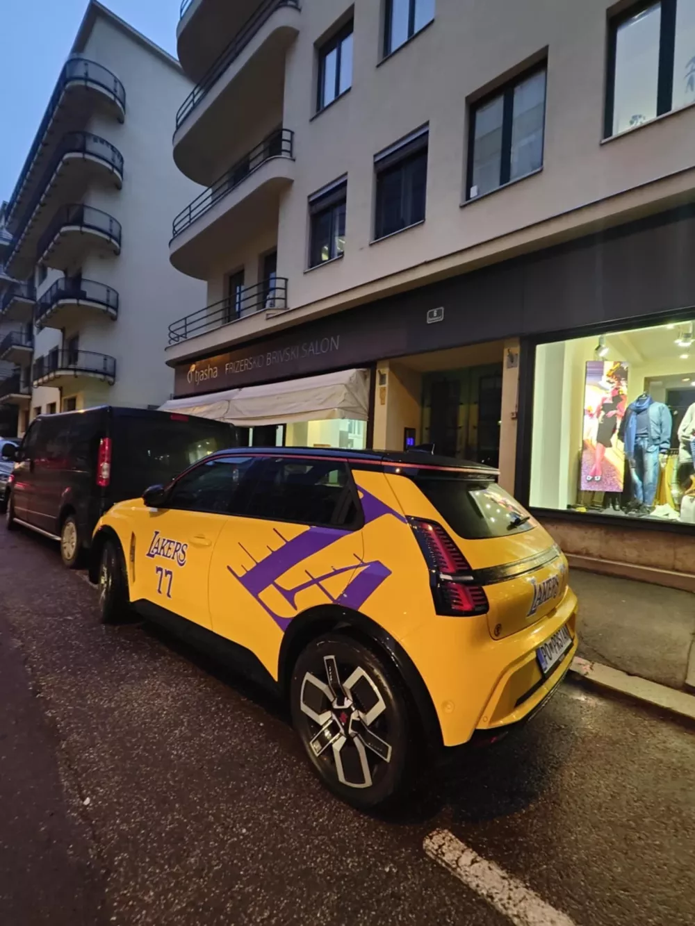 V ZDA športni novinarji tudi deset dni po prestopu Luke Dončića iz Dallasa k ekipi Los Angeles Lakers komaj govorijo o čem drugem. O tem, kako odmeven je bil prestop, priča tudi dejstvo, da je slovenski košarkarski as zasenčil celo priprave na super bowl, ki je z naskokom največji športni dogodek v ZDA. Prestop smo seveda opazili tudi v Sloveniji, te dni pa je na ljubljanskih ulicah možno zaslediti še prav poseben avtomobil. Gre za Renaultovo električno »petko« v vijolični in zlati barvi jezernikov ter s te dni najbolj vročo številko 77.