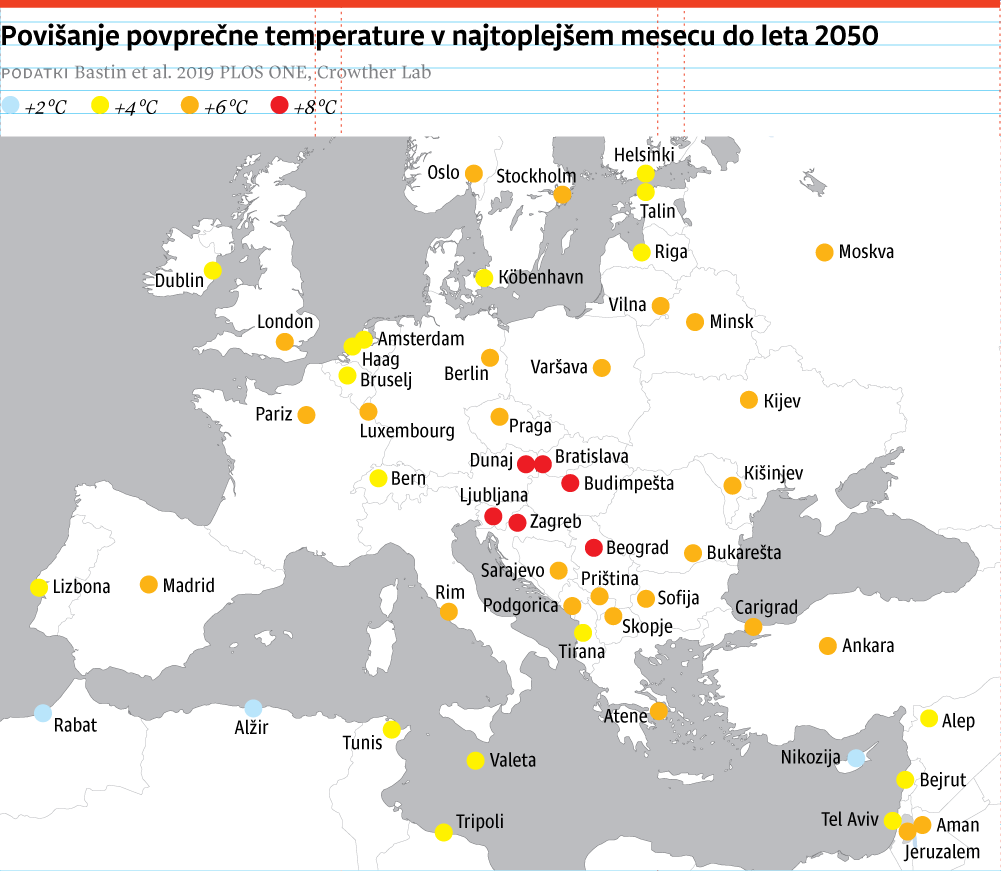 Po študiji švicarskega inštituta Crowther Lab se bodo do leta 2050 temperature v večini svetovnih mest močno povišale. Najbolj drastične spremembe napovedujejo ravno Ljubljani, kjer naj bi bil najtoplejši mesec za osem stopinj Celzija toplejši, povprečna letna temperatura pa naj bi se dvignila za 3,5 stopinje Celzija. Izredno povišanje temperatur je po študiji Crowther Laba skoncentrirano ravno na območju srednje Evrope in Balkana, kjer naj bi bilo podnebje leta 2050 podobno tistemu v teksaških mestih oziroma mestih tisoč kilometrov južneje.