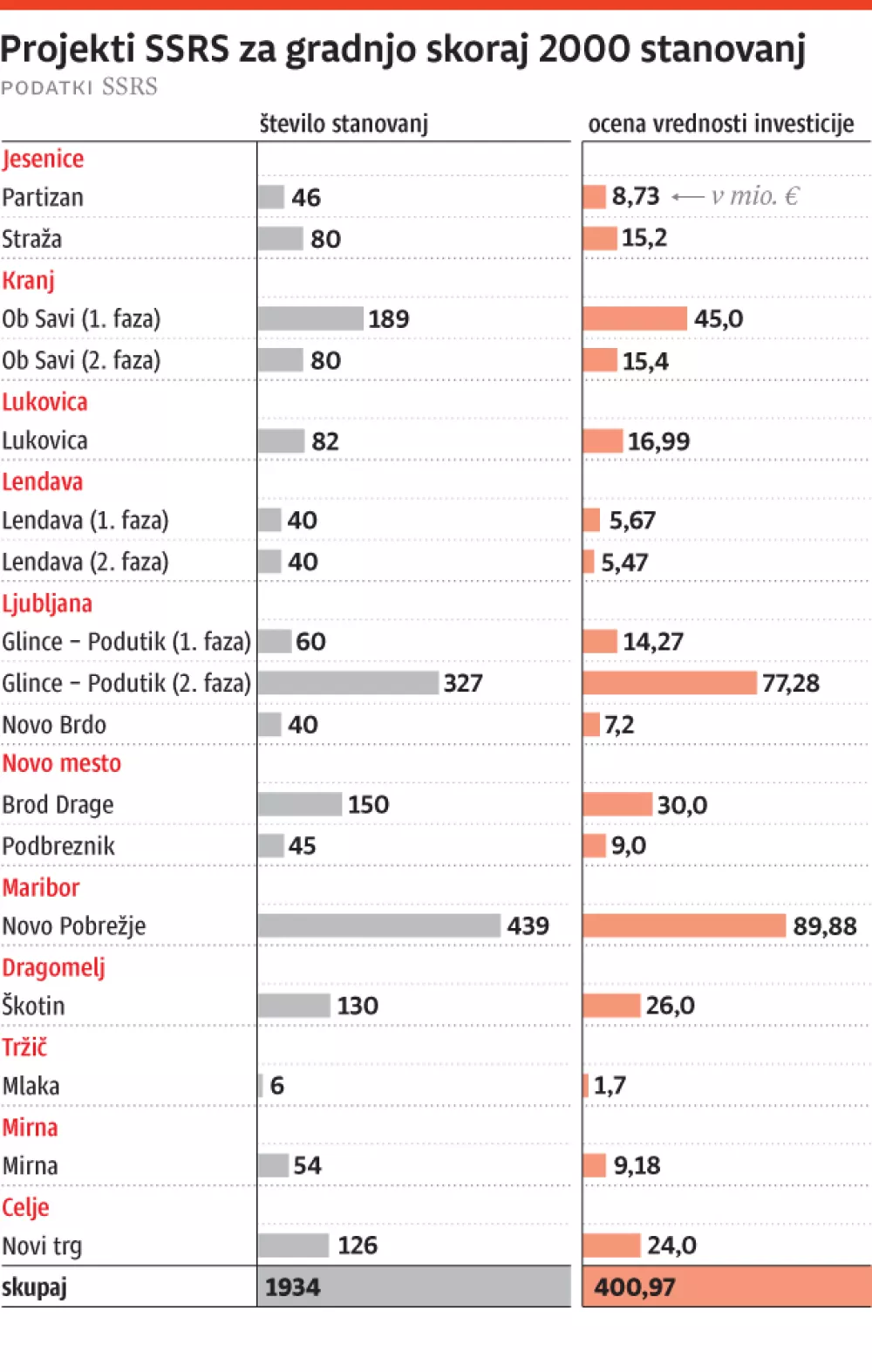 Predsednik uprave Stanovanjskega sklada Republike Slovenije Črtomir Remec je pojasnil, da so gradnjo 46 stanovanj na Jesenicah in 40 v Lendavi že začeli, tik pred začetkom graditve pa je še 40 dodatnih stanovanj v Lendavi in 82 v Lukovici. Za gradnjo 439 stanovanj v Mariboru ter 386 stanovanj v ljubljanskem Podutiku že pridobivajo gradbeni dovoljenji in še v letošnjem letu pričakujejo začetek gradnje, je dejal.