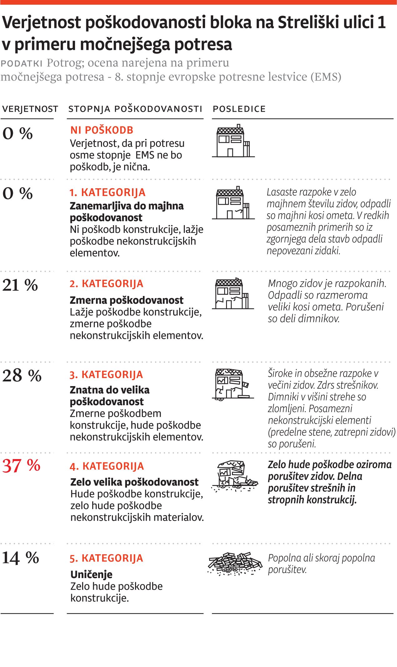 Šele ta raziskava bo precej natančno ugotovila, kaj bi se v primeru močnejšega potresa zgodilo s temi stolpnicami, a že zdaj je jasno, da bi bile posledice bržkone katastrofalne. Po napovedih portala Potrog bi recimo stolpnica na Streliški ulici 1 z 51-odstotno verjetnostjo ob močnejšem potresu 8. stopnje po evropski makroseizmični lestvici (EMS) utrpela zelo resne poškodbe z delnimi porušitvami stropov in strehe ali celo popolno uničenje. Verjetnost, da bi ob močnejšem potresu od nje ostale le ruševine, je kar 14-odstotna. Podobno velja za druge stolpnice iz raziskave, čeprav so nekatere grajene nekoliko drugače in bi se morebiti bolje zoperstavile potresu. A na to bo odgovore dala omenjena raziskava.