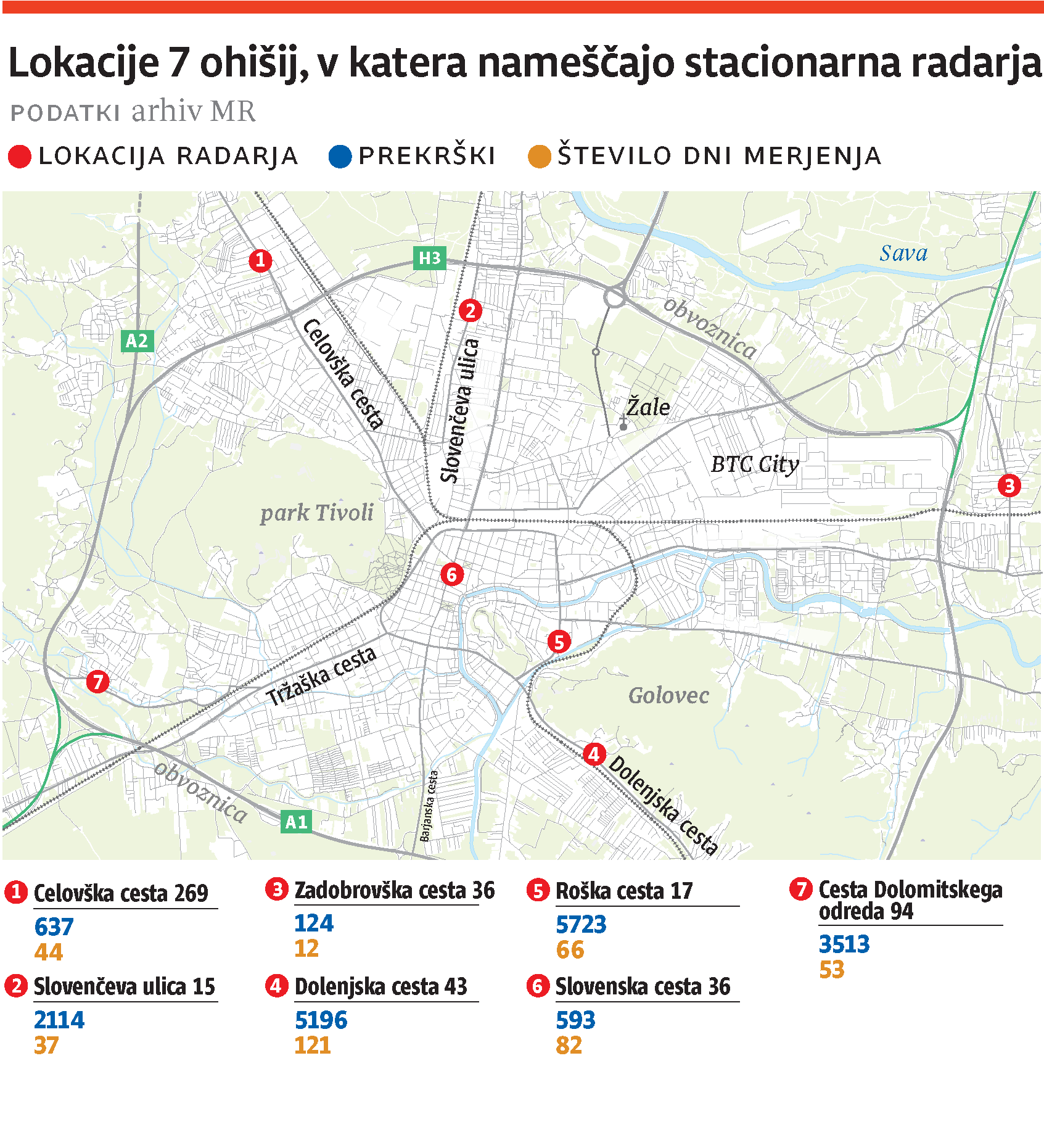 Po podatkih iz stacionarnih radarjev je največ voznikov lani imelo težko nogo na Roški cesti, tam je stacionarni radar v 66 dneh meritev hitrosti zaznal 5723 prekrškarjev. Zanimivo je, da je recimo druga lokacija z največ zaznanimi prekrški Dolenjska cesta, kjer je bilo kršiteljev 5196, a je tam radar meril bistveno več dni kot na Roški, in sicer 121 dni.
