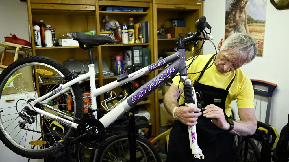 Na policah delavnice, kjer se kolesa popravljajo, so po škatlah sortirani tudi rezervni deli. »Vsako kolo pogledamo in ocenimo, ali se nam popravilo dejansko izplača. Če je kolo zelo utrujeno, ga razstavimo in ohranimo samo tisto, kar lahko uporabimo kot rezervni del, preostalo potem sortiramo za odpad. Tako se je nabralo kar nekaj retro zvoncev, tudi hup. V vsem tem času smo zbrali tudi različne kolesarske sedeže, ki jih nameščamo namesto poškodovanih,« je dejal Behrić in pokazal na polne lesene zabojčke.